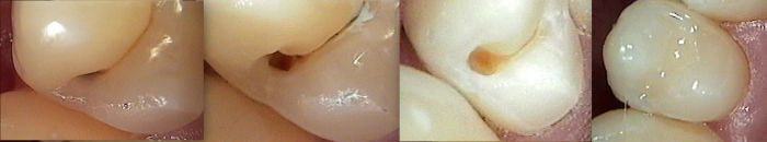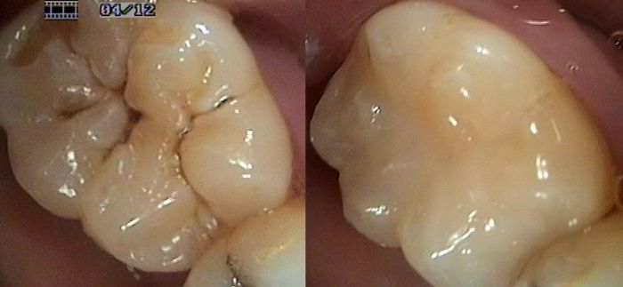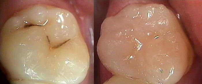 To answer this you need to know what a tooth fissure is. Fissures are the nooks & crannies on the biting surfaces of the permanent “chewing” teeth (molars & premolars). These areas help the chewing process to mash up your food. These areas commonly decay as food gets trapped in them. Tooth brush bristles aren’t long enough or thin enough to remove this food.The food stagnates & the decay process begins. Using air abrasion technology & plaque & decay detecting dye, it is now possible to thoroughly clean these pits & fissures ensuring there is no decay ors food debris present. The fissure is then sealed with a long lasting, flowable, light cured white filling material.