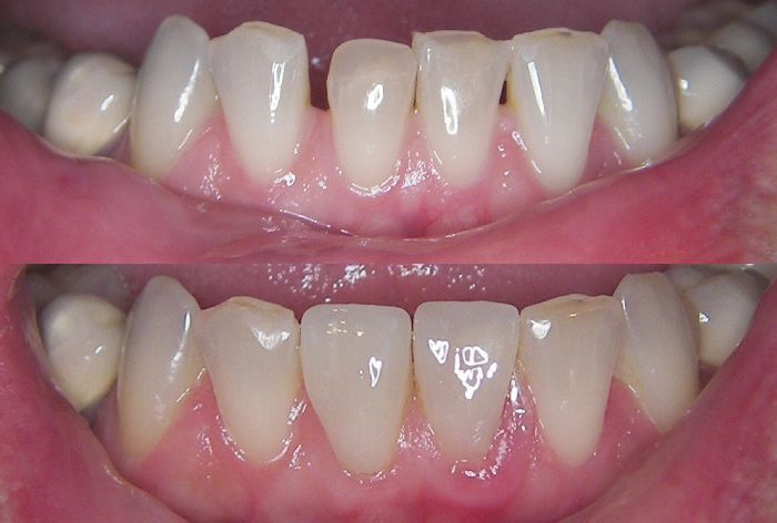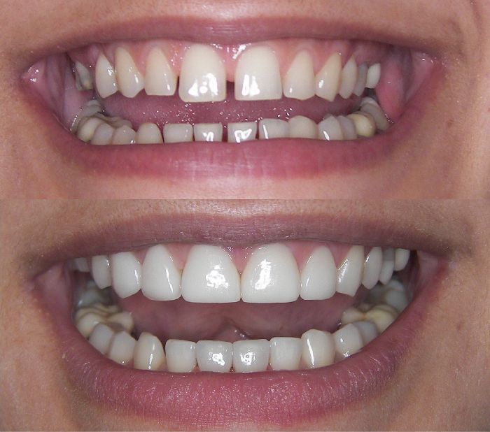 Tooth veneers are thin slivers of porcelain or composite resin which are permanently cemented to the front teeth. They can dramatically improve the appearance of teeth that are broken, chipped, misshaped, crooked, stained or discoloured. They are also great for closing gaps between teeth. Tooth veneers take up very little space thus only a small amount of tooth is removed to allow room for them. They work along the same lines as a false finger nail, masking the problem area. See below for before and after cases
